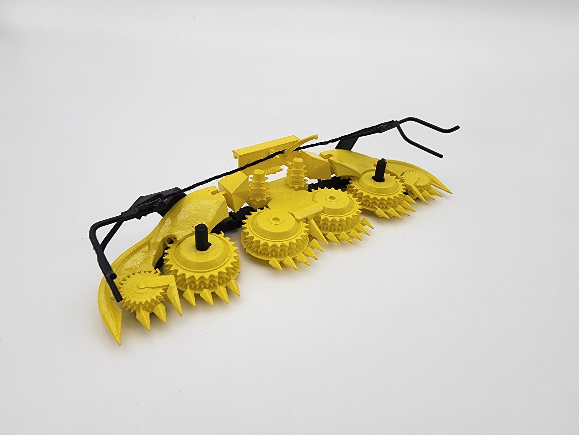 Yellow 10row silage head designed to fit a 7series green harvester. Can be glued rigid or pinned to fold. Comes with a mounting plate to attach to the harvester.
