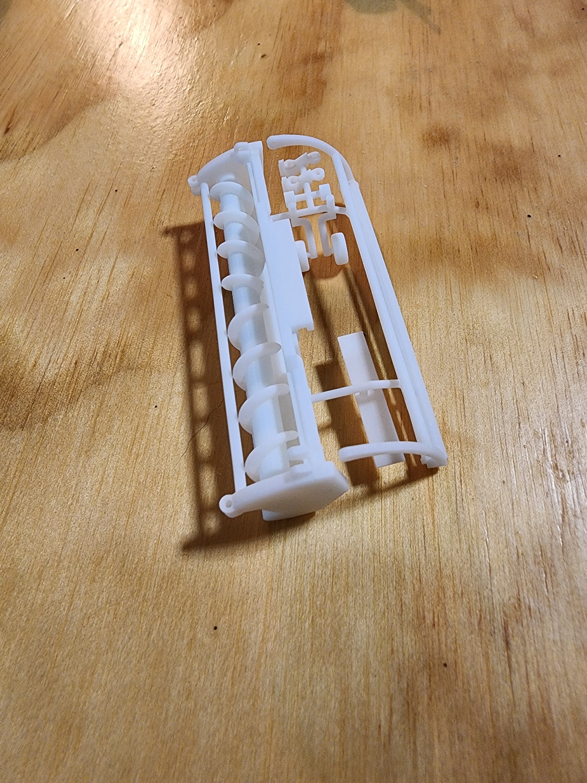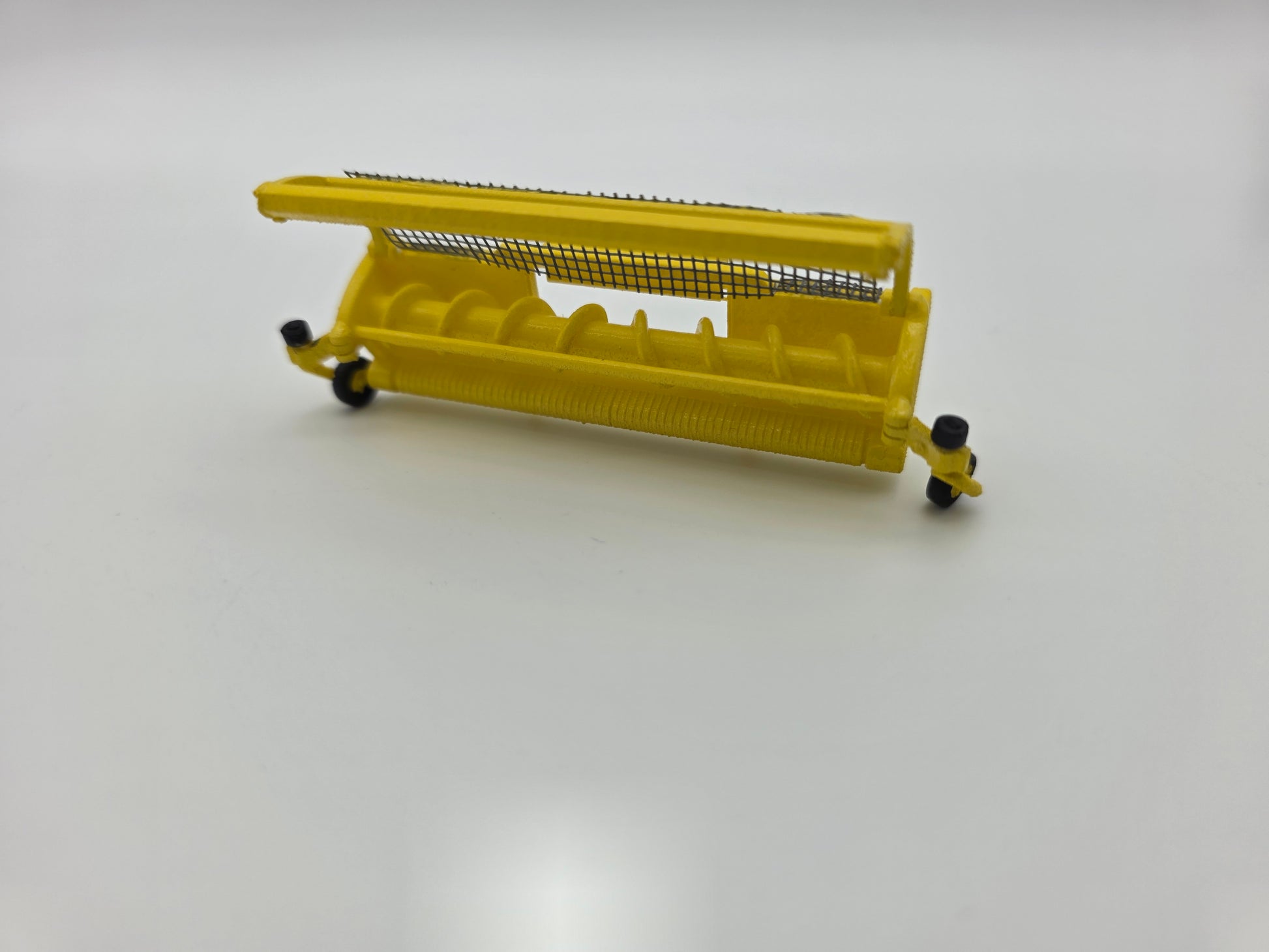 1/64 scale yellow pickup head designed to fit a 7series green harvester. Can be glued rigid or pinned to fold. Comes with a mounting plate to attach to the harvester.